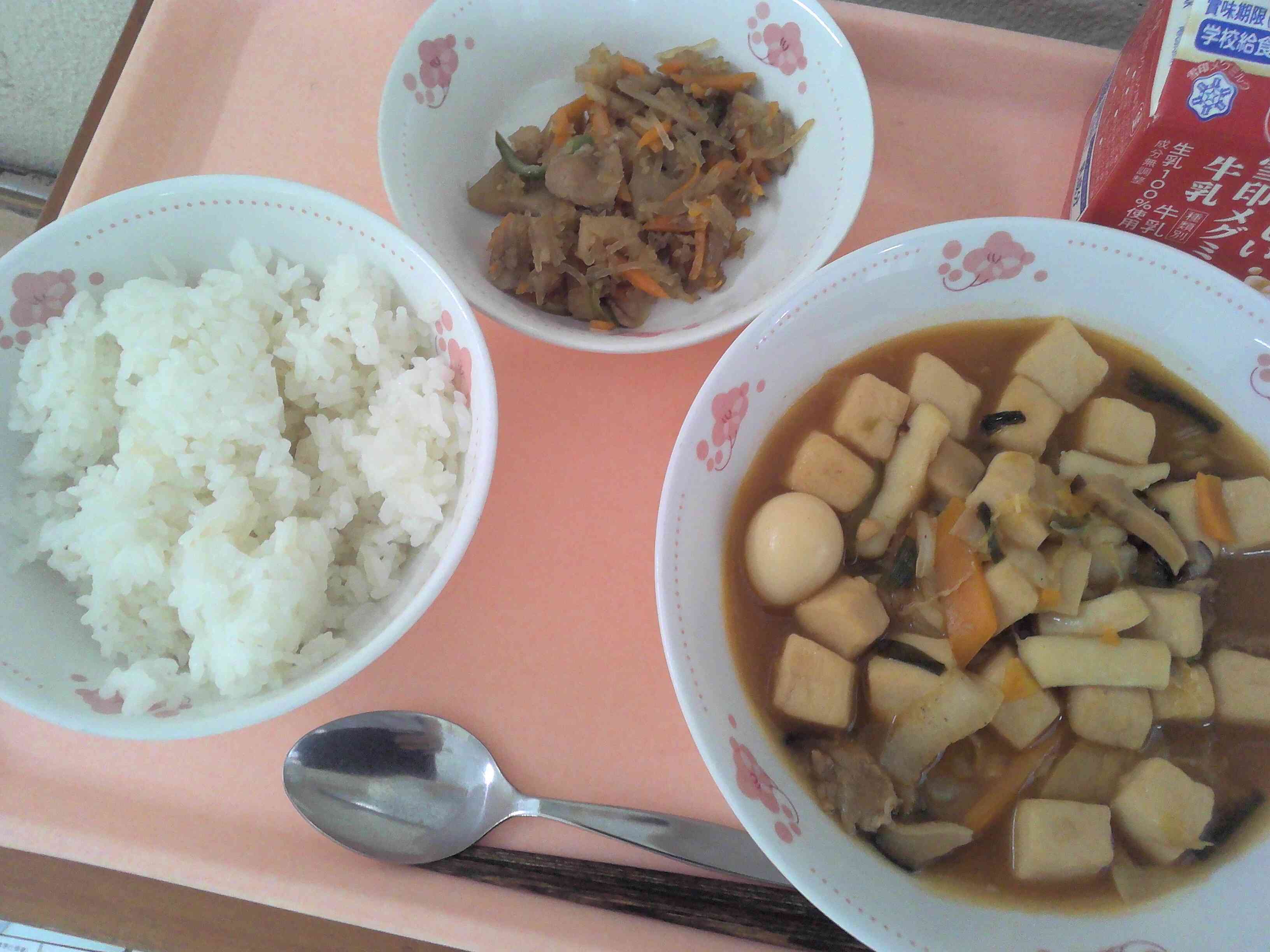 ✿ ご飯 ✿ 牛乳 ✿ スンドゥブチゲ ✿ れんこんと春雨の炒め物