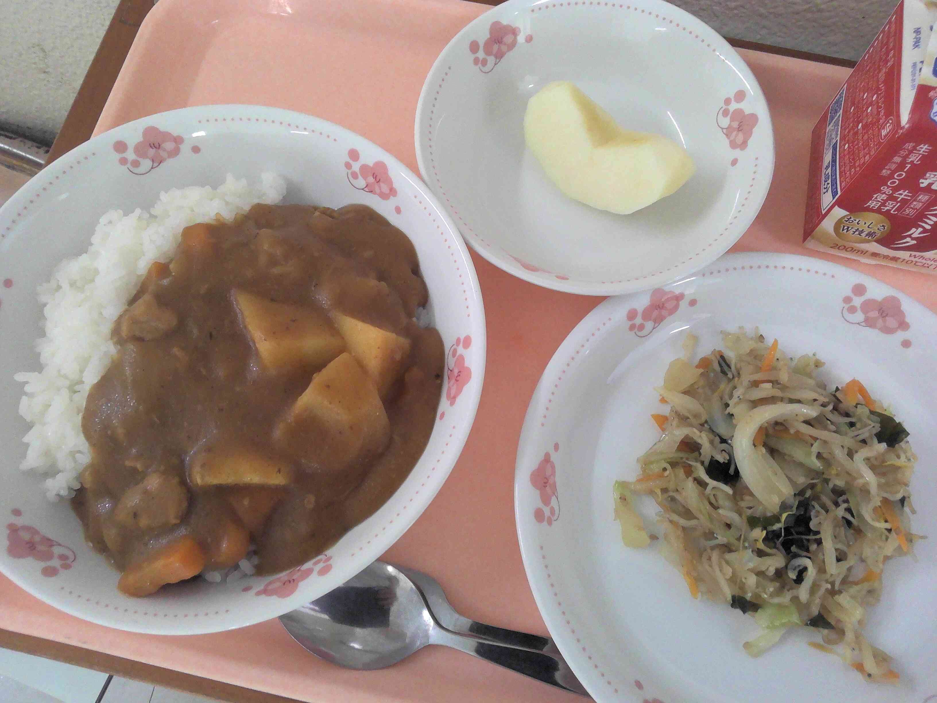 ✿ チキンカレーライス ✿ 牛乳 ✿ じゃこサラダ ✿ りんご 今日は給食委員会の意見箱で人気のあった「チキンカレーライス」です。