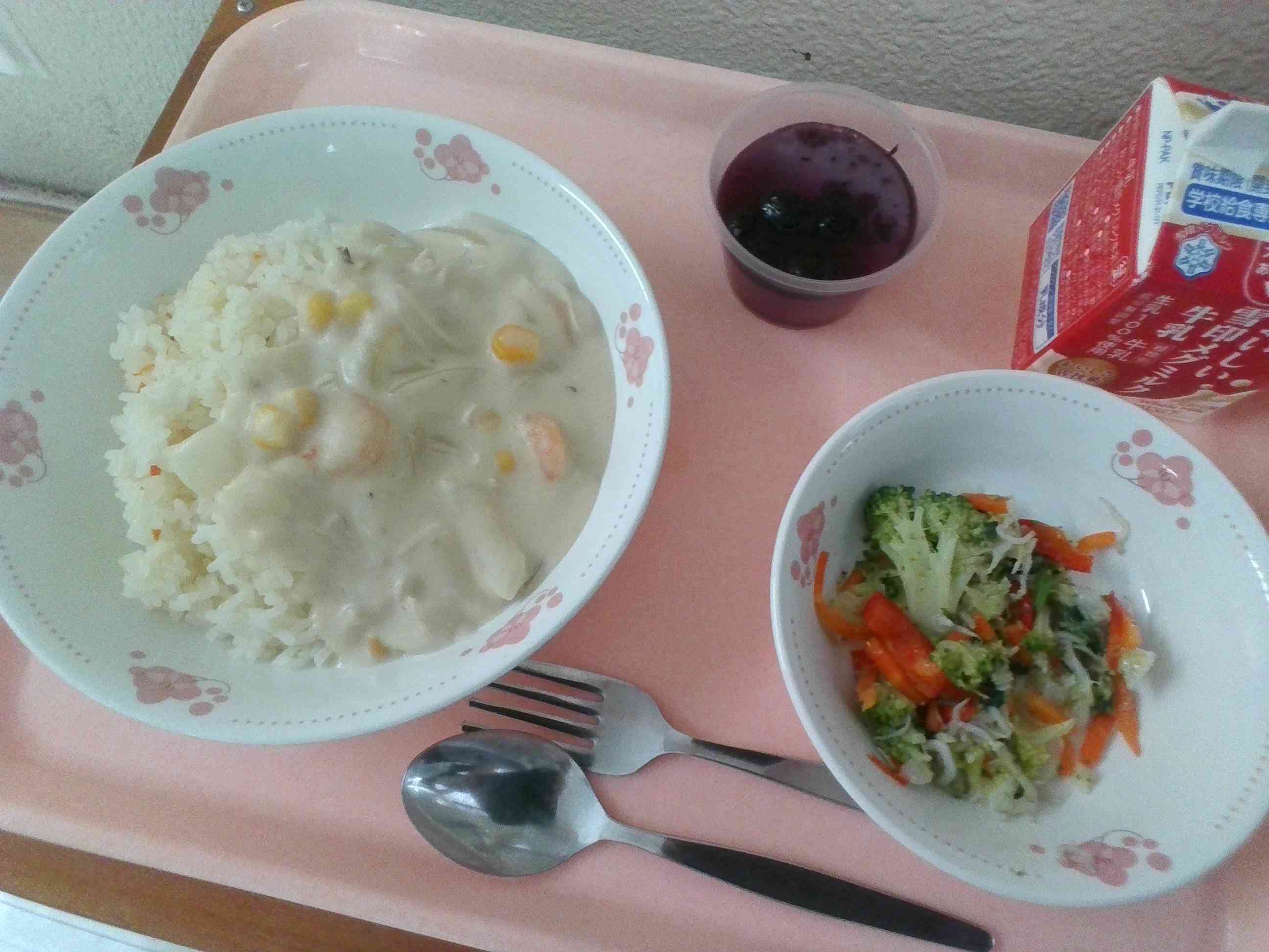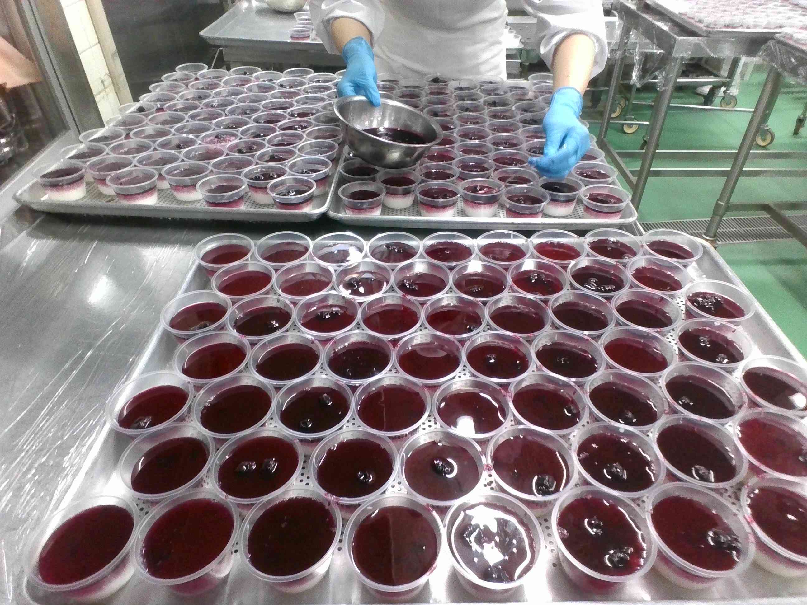 *目の愛護デー給食* ✿ キャロットライスのホワイトソースかけ ✿ 牛乳 ✿ ビタミンサラダ ✿ 牛乳寒天ブルーベリーソース 写真2枚目は、調理員さんが牛乳寒天にブルーベリーソースを1つ1つ丁寧にかけてくれている様子です。