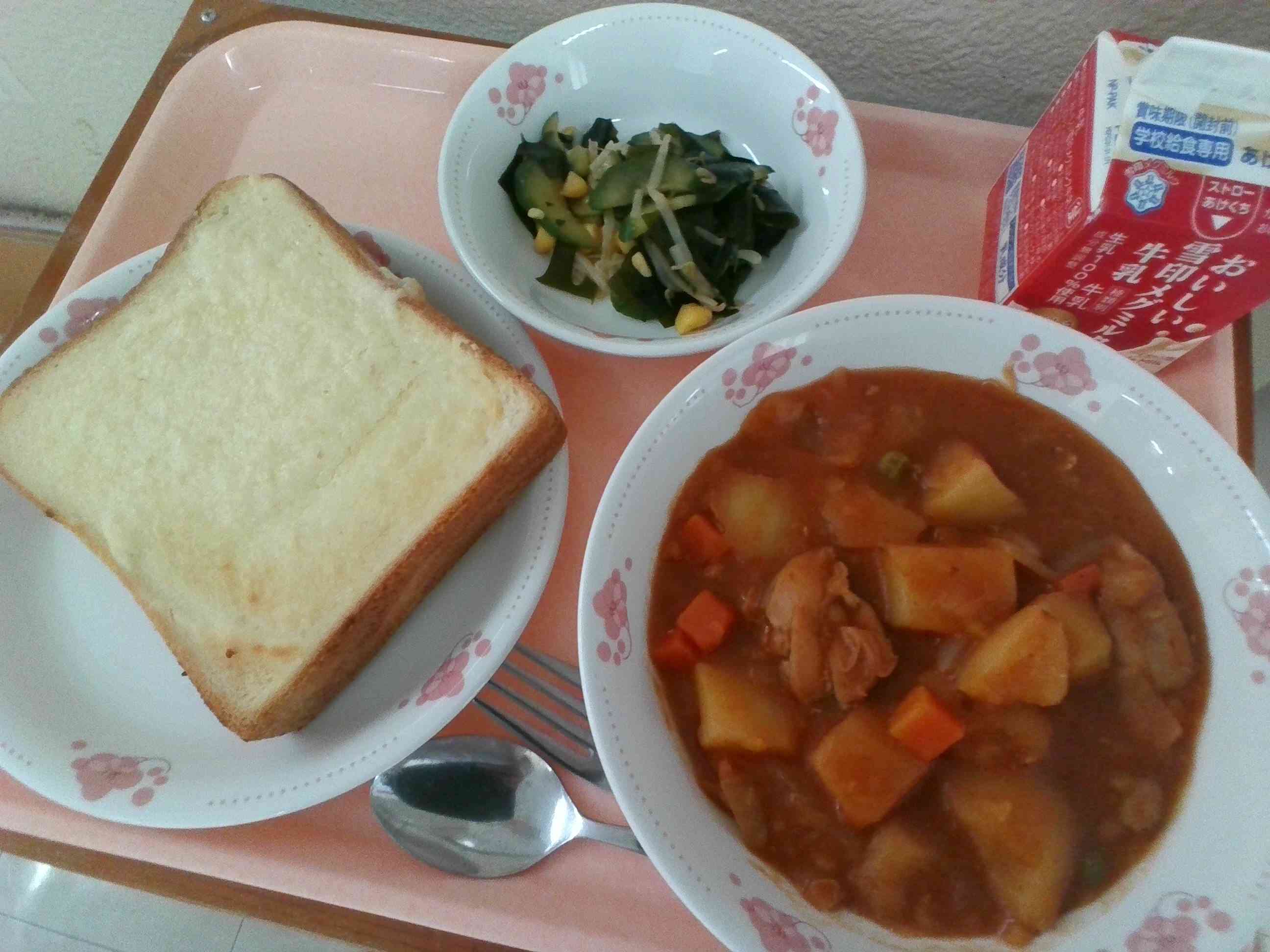 ✿ クリームチーズトースト ✿ 牛乳 ✿ わかめとコーンのサラダ ✿ 鶏肉のブラウンシチュー
