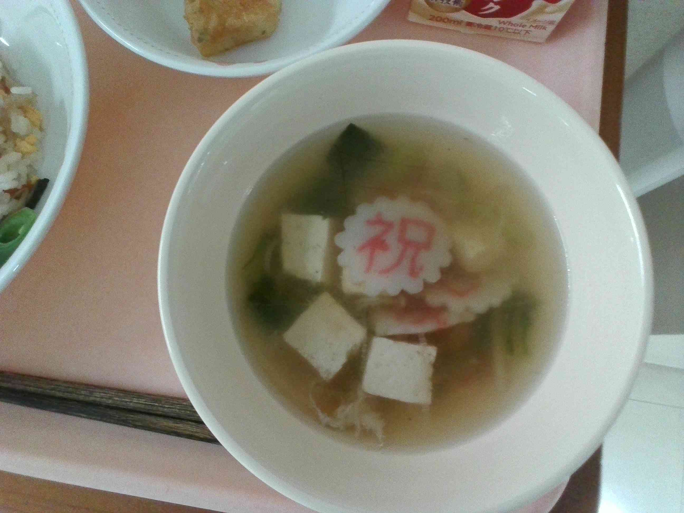 *開校記念日お祝い給食* ✿ ちらしずし ✿ 牛乳 ✿ いかのいそべ揚げ ✿ お祝いすまし汁 ✿ 菊花みかん 写真2枚目は、お祝いすまし汁に入れた【祝】の文字入りのなるとです!
