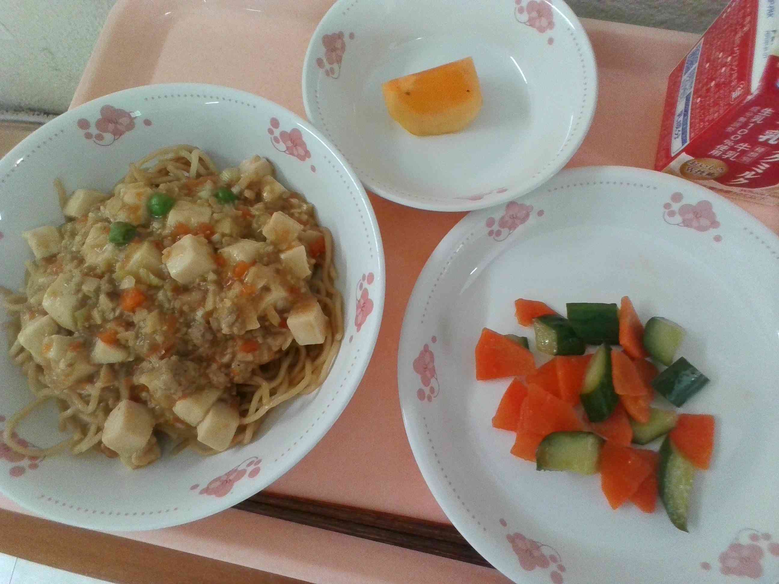 ✿ 麻婆麺 ✿ 牛乳 ✿ きゅうりと人参の華風甘酢 ✿ 柿