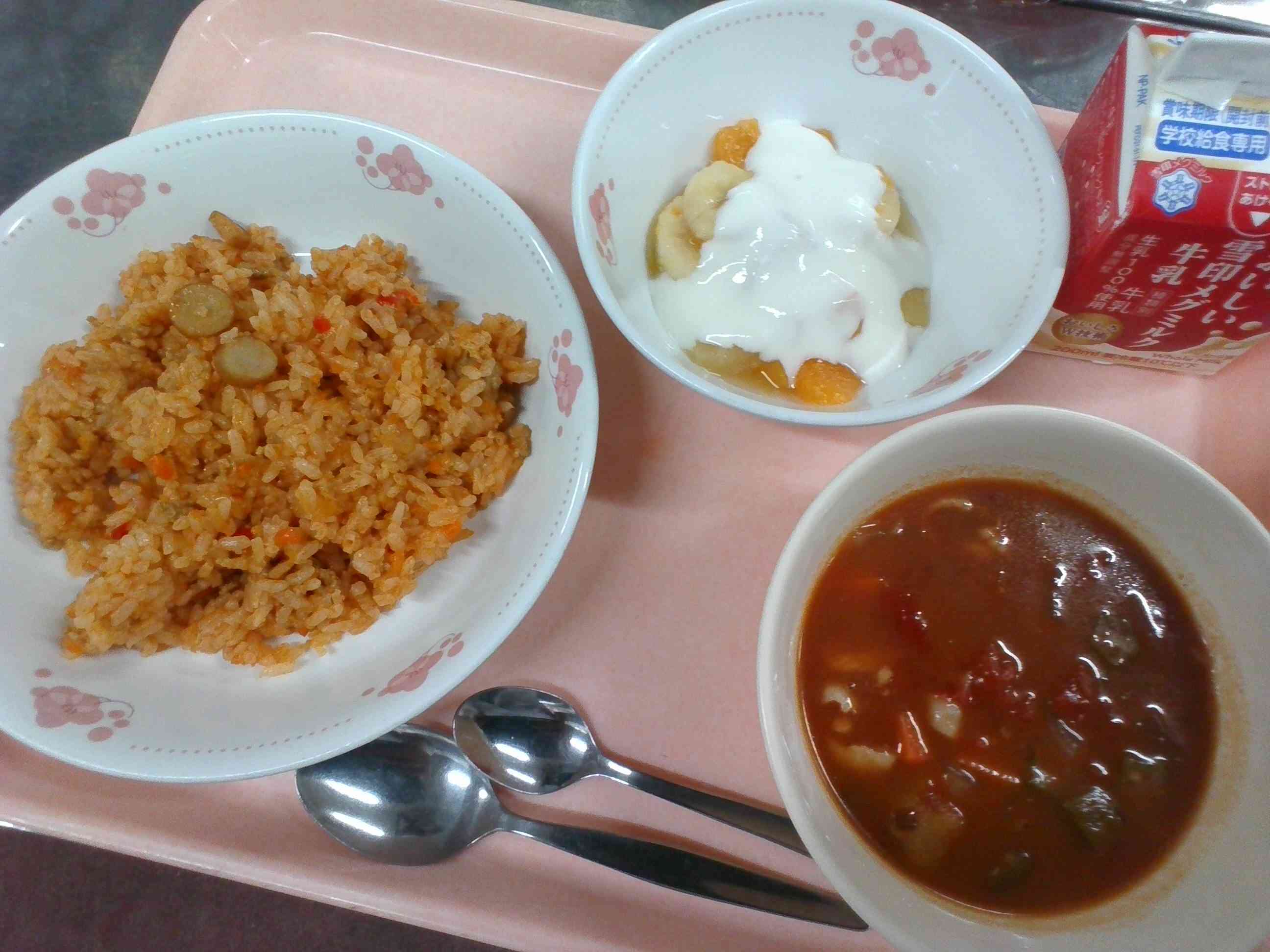 *世界の料理:アメリカ* *ランチルーム給食:4−3* ✿ ジャンバラヤ ✿ 牛乳 ✿ ガンボスープ ✿ フルーツのヨーグルト添え