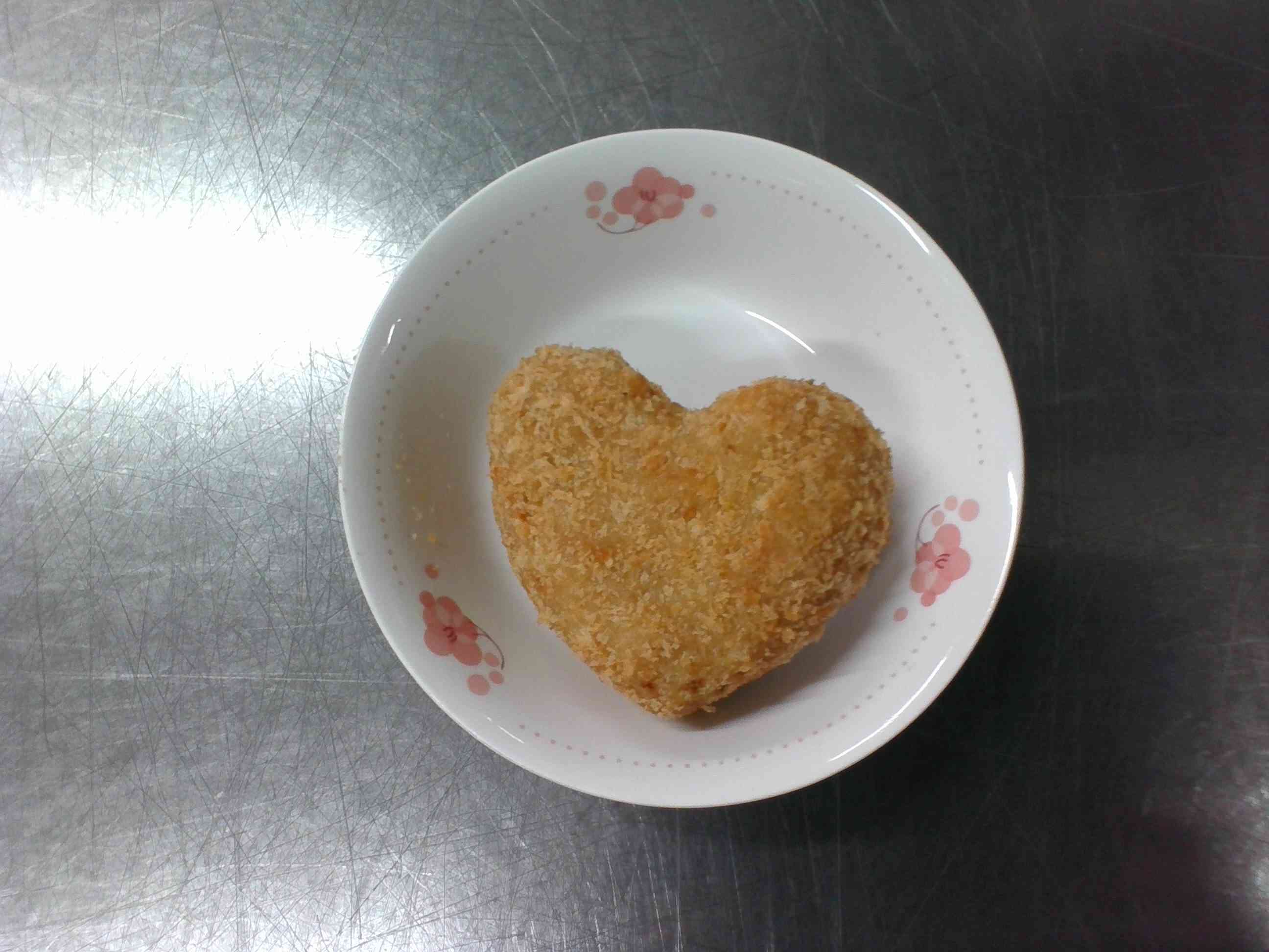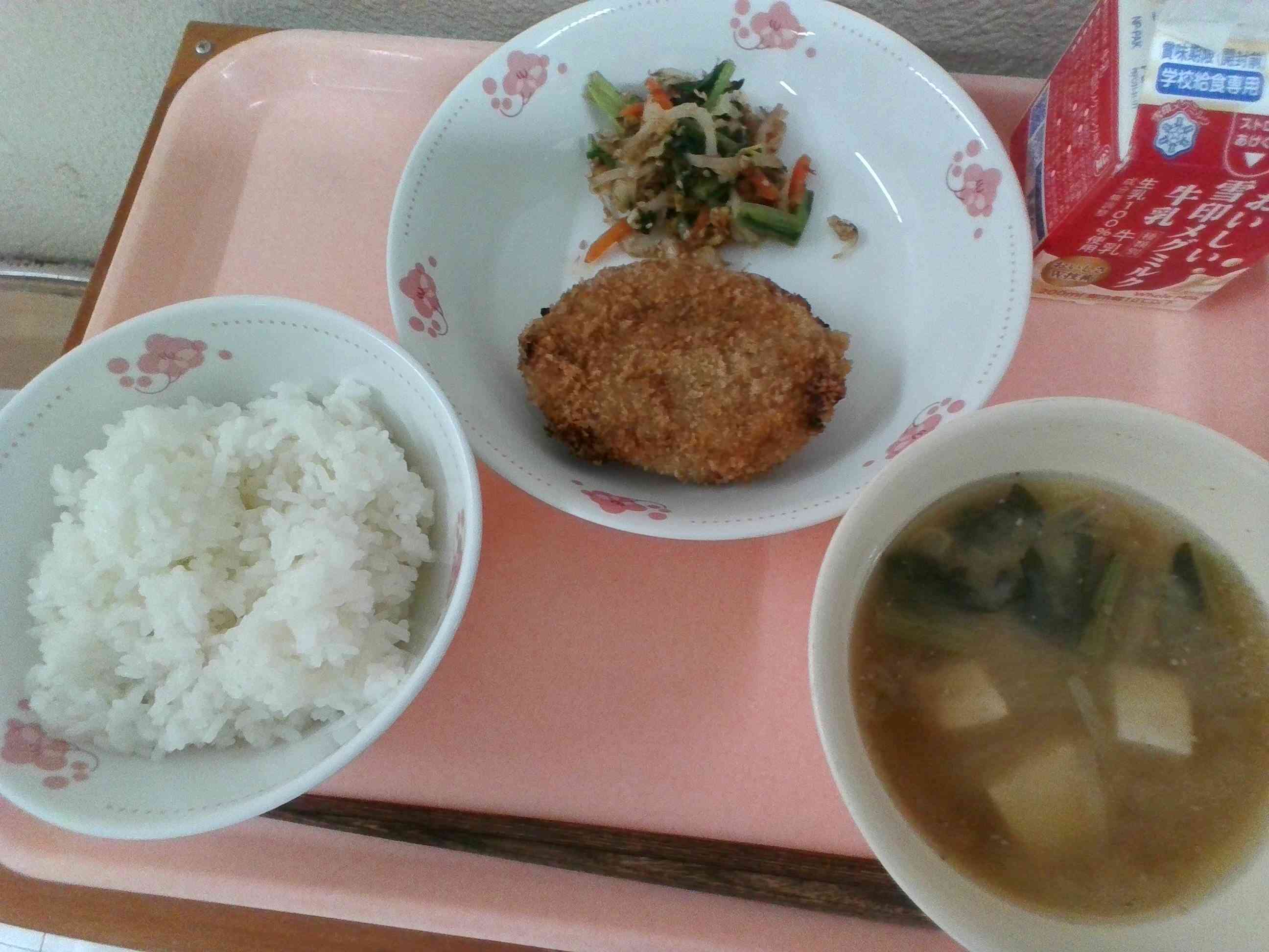 *ランチルーム給食:4−2* ✿ ご飯 ✿ 牛乳 ✿ 肉じゃがコロッケ ✿ 白菜と小松菜のおひたし ✿ すりごまのみそ汁 写真2枚目は、調理員さんが肉じゃがコロッケを1つだけハート型にしてくれました。