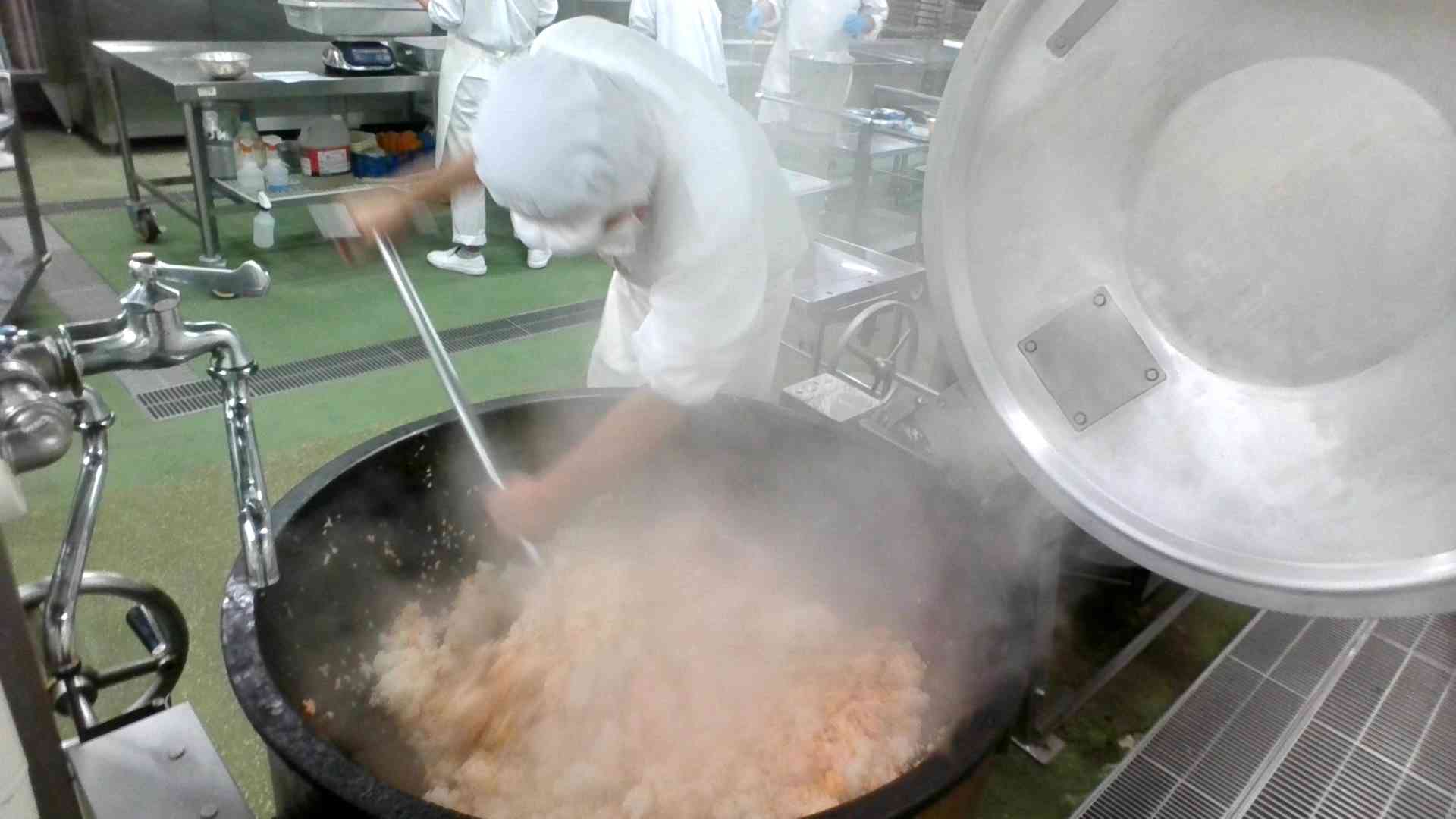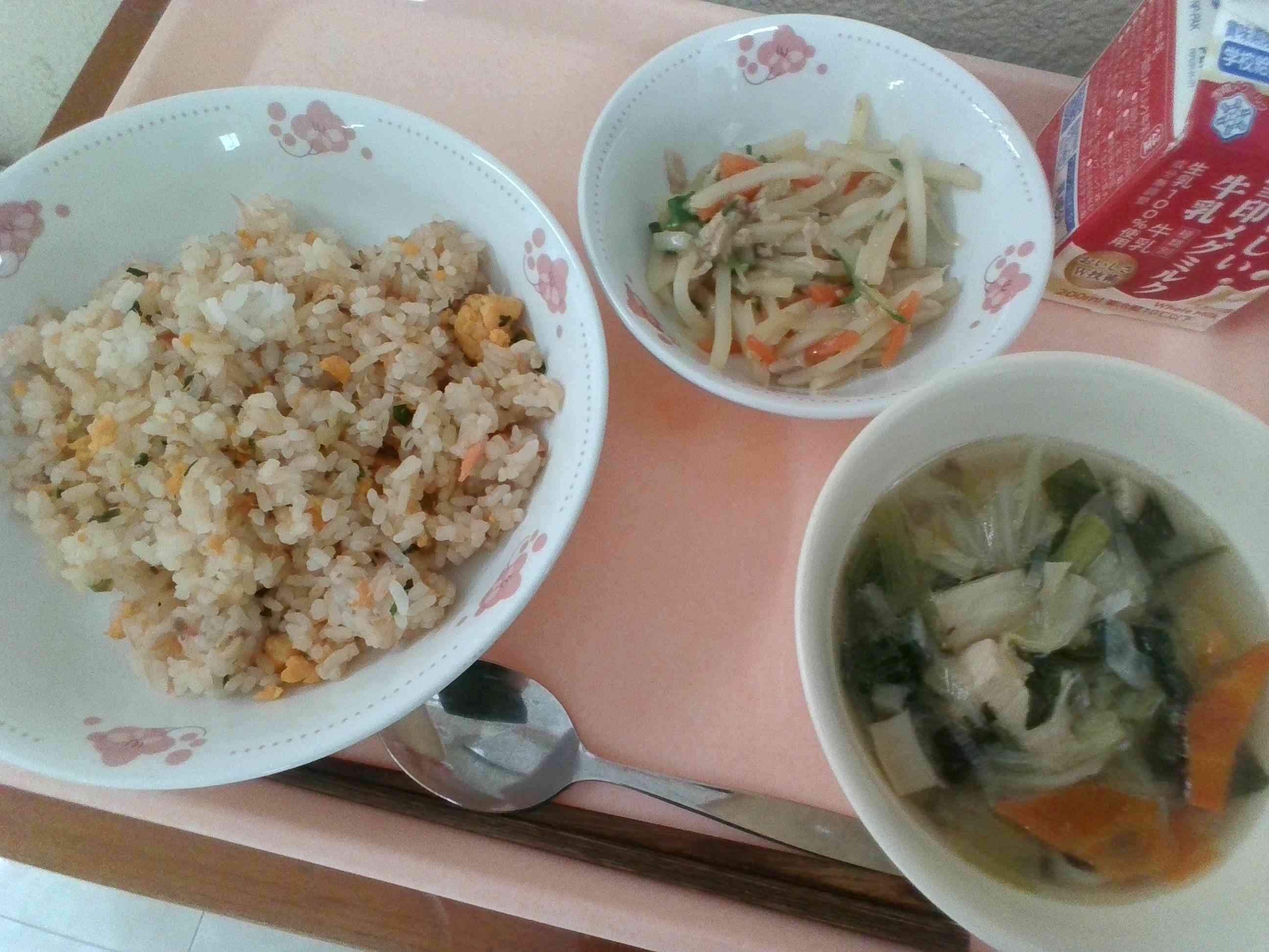 ✿ さけ炒飯 ✿ 牛乳 ✿ じゃがいもの中華風サラダ ✿ 中華スープ 写真2枚目は、さけ炒飯を大きな釜で炒めて作っているところです。 調理員さんの炒める動きが早いため、少しぶれてしまいました。 さけも大きな切り身を焼いたあと、骨が無いか確認しながら調理員さんが丁寧にほぐしてくれました。