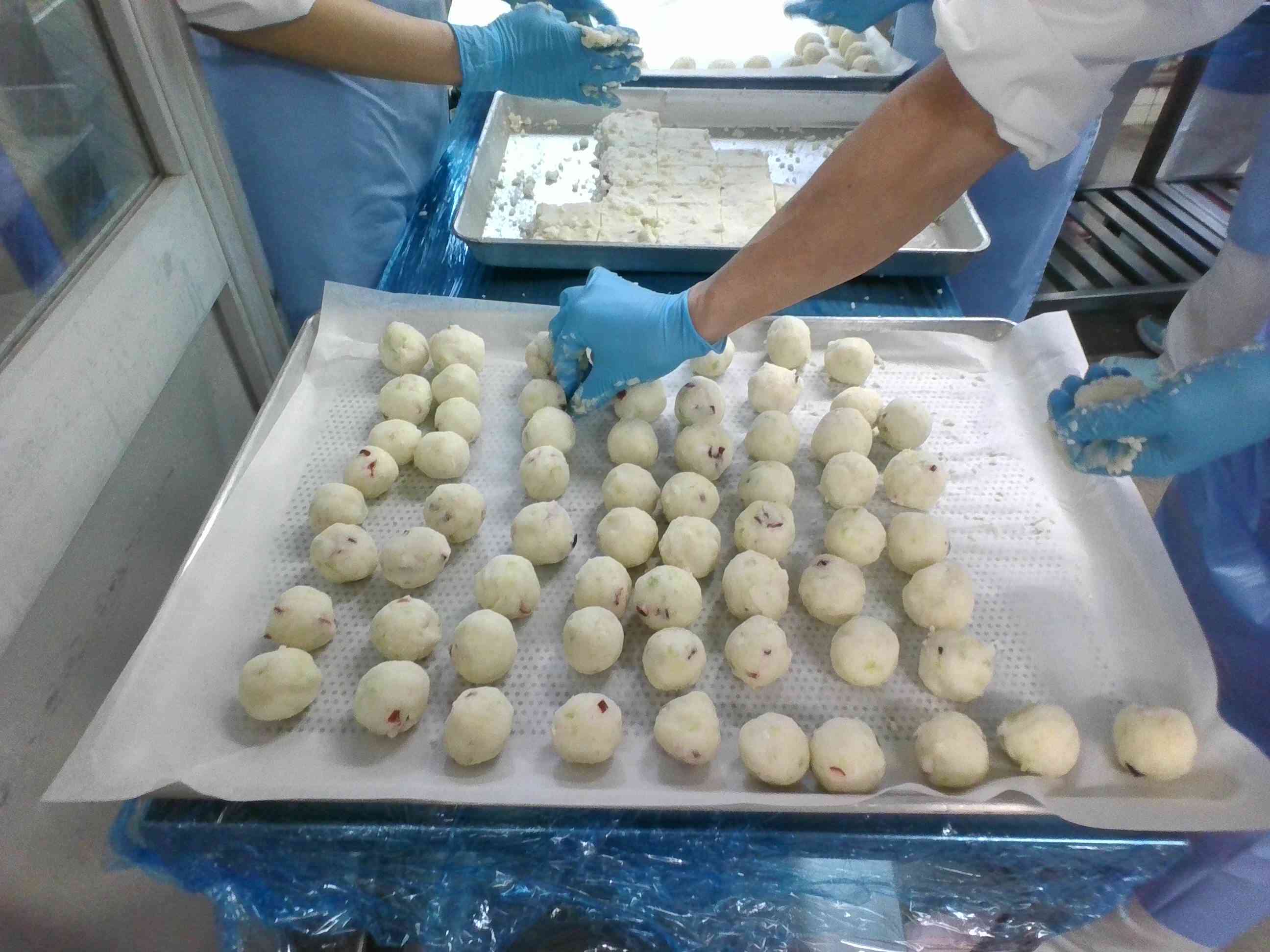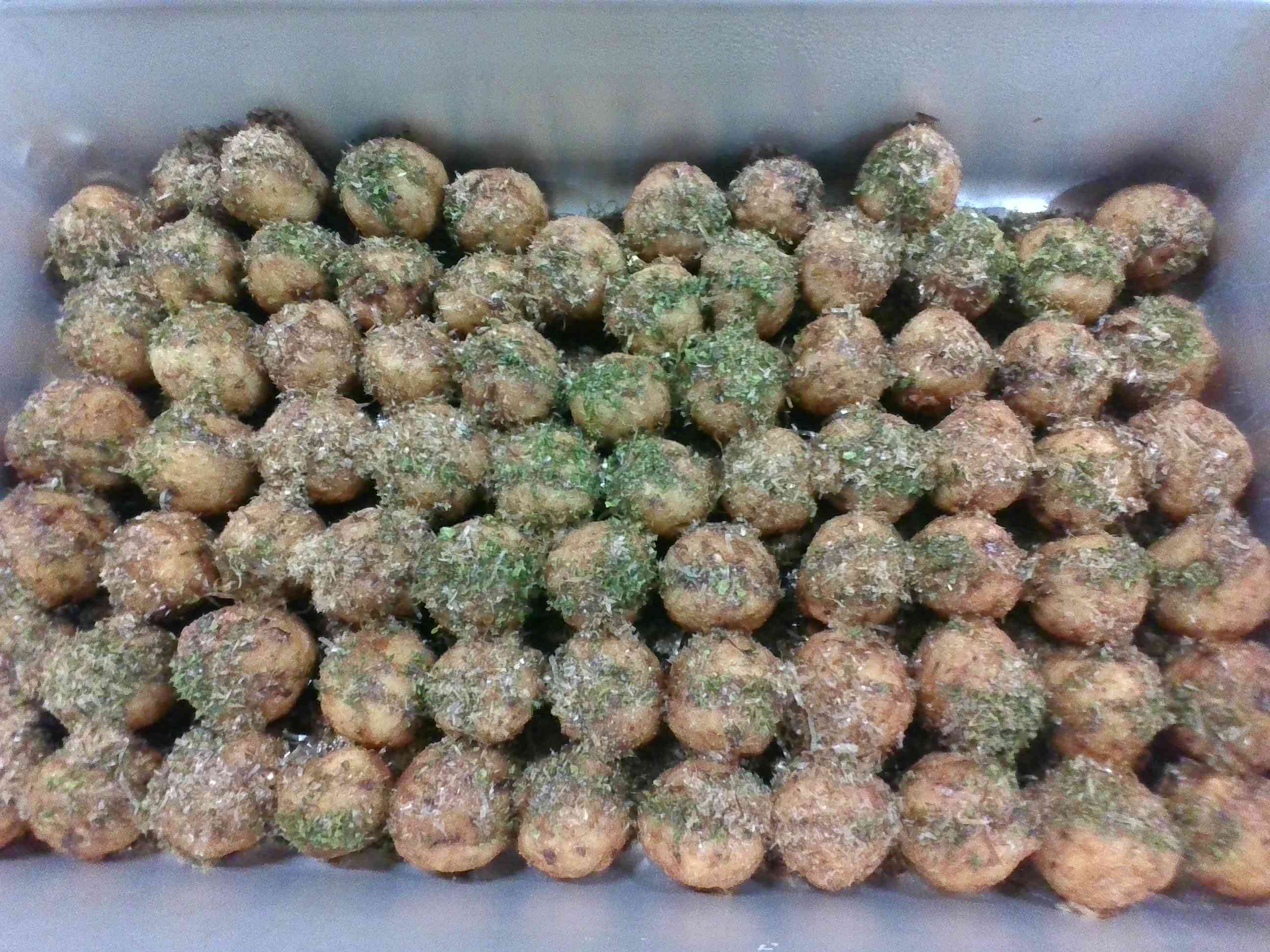 ✿ 白ごまタンタンうどん ✿ 牛乳 ✿ ポテトたこあげ ✿ 花みかん 「ポテトたこあげ」は新メニューです! 写真2枚目は、調理員さん総出で一生懸命、成型している様子です。 写真3枚目は、ソース・青のり・かつおぶしをかけて完成した写真です。 サンプルケースのところに【たこやきのたこさぶろう】の絵本も展示しました!