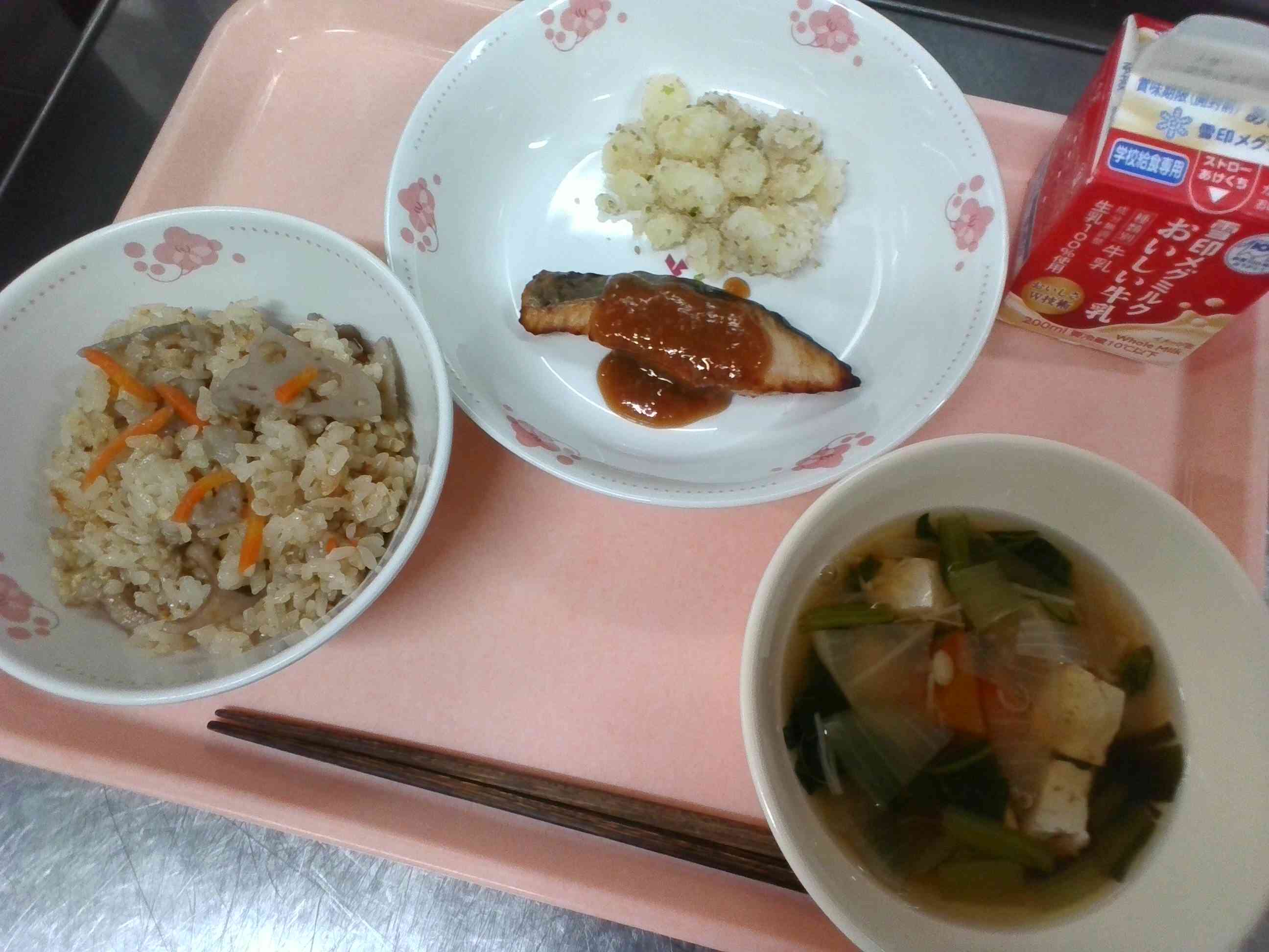✿ れんこんごはん ✿ 牛乳 ✿ さわらのゆずみそ焼き ✿ じゃがいもの香味あえ ✿ 小松菜とえのきのすまし汁
