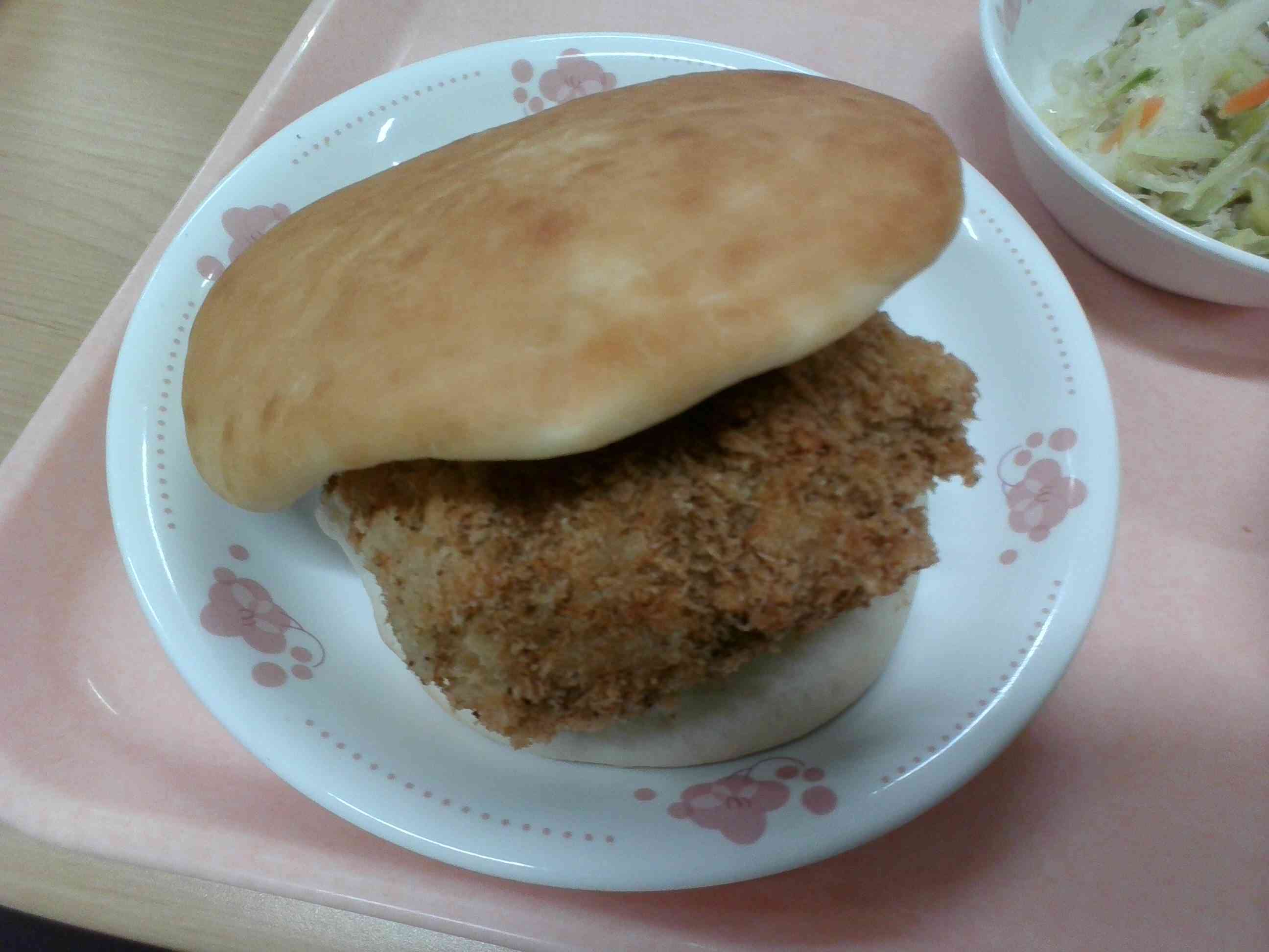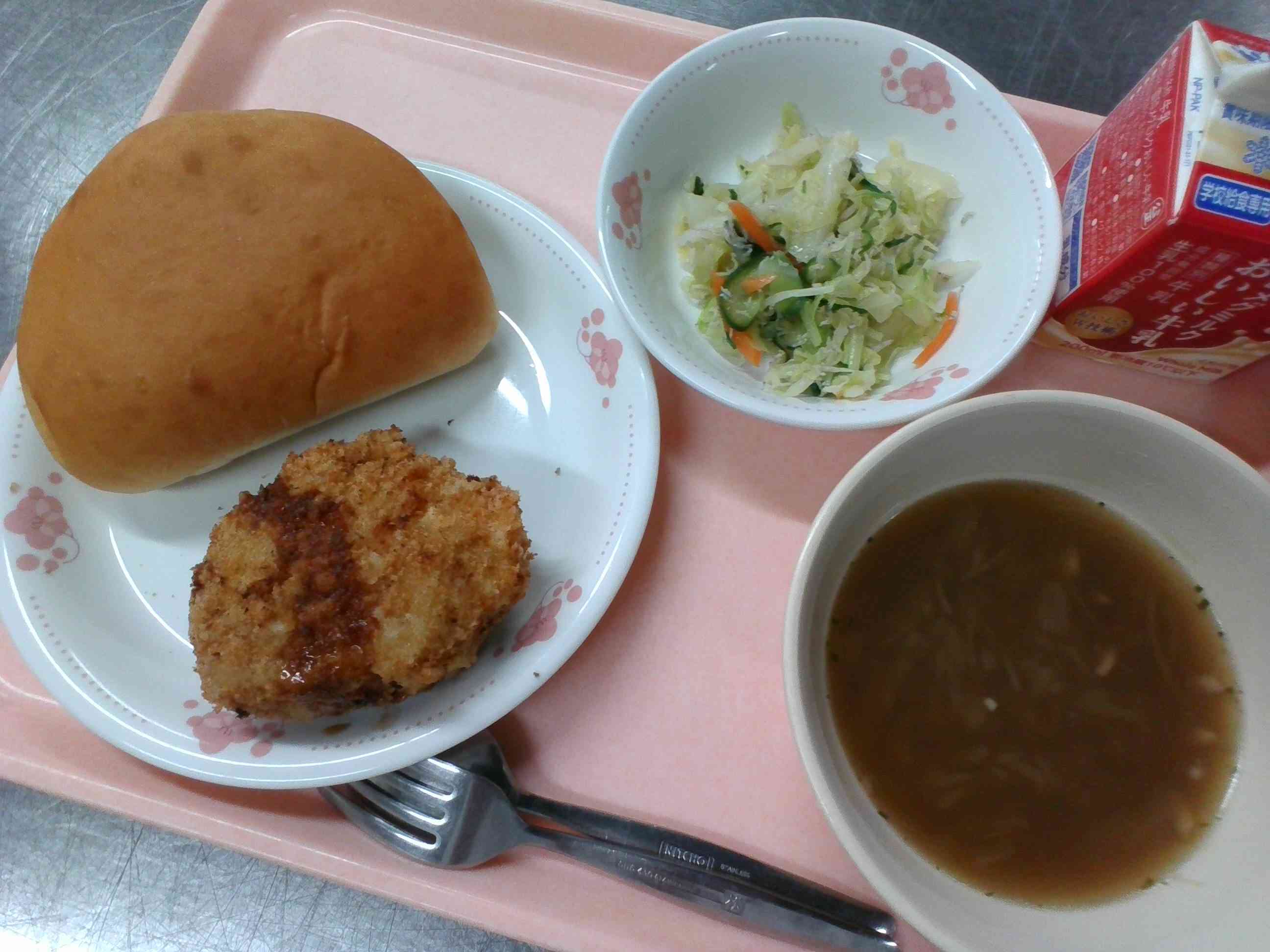 ✿ セルフコロッケパン ✿ 牛乳 ✿ 水菜とじゃこのサラダ ✿ オニオンスープ