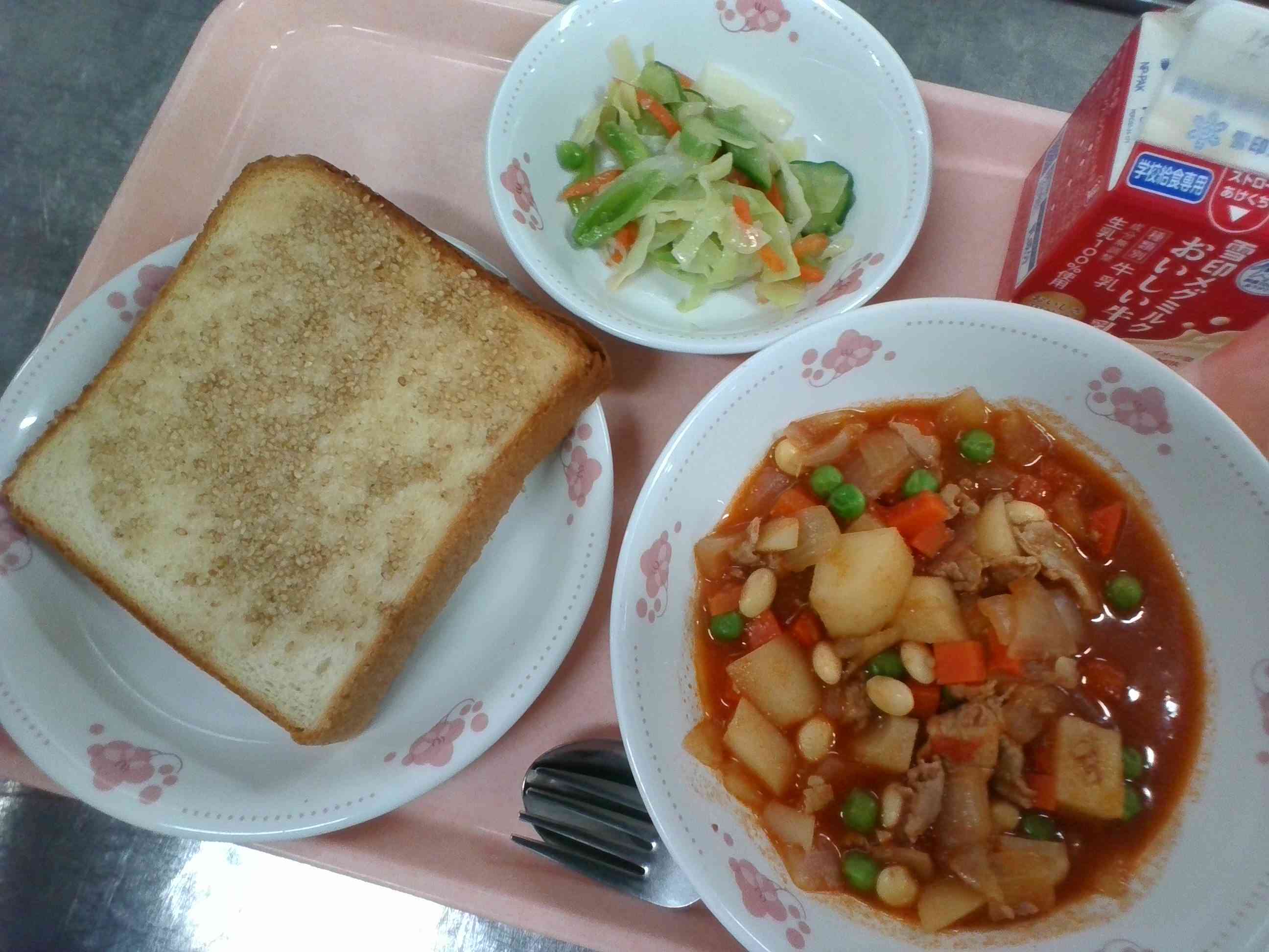 ✿ セサミトースト ✿ 牛乳 ✿ スプリングサラダ ✿ ポークビーンズ