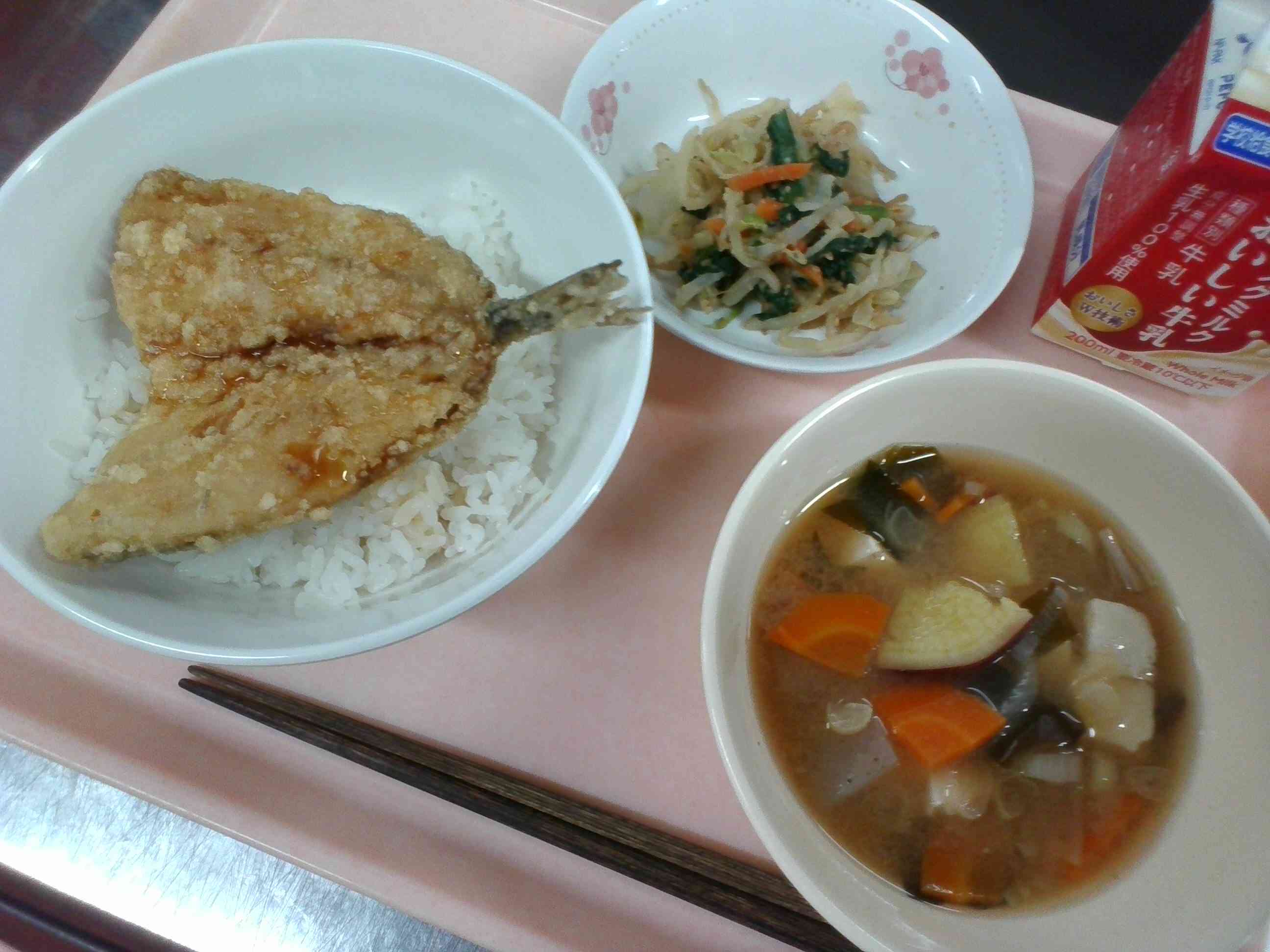 *食育の日給食* ✿ あじのかば焼き丼 ✿ 牛乳 ✿ ごまあえ ✿ さつま汁