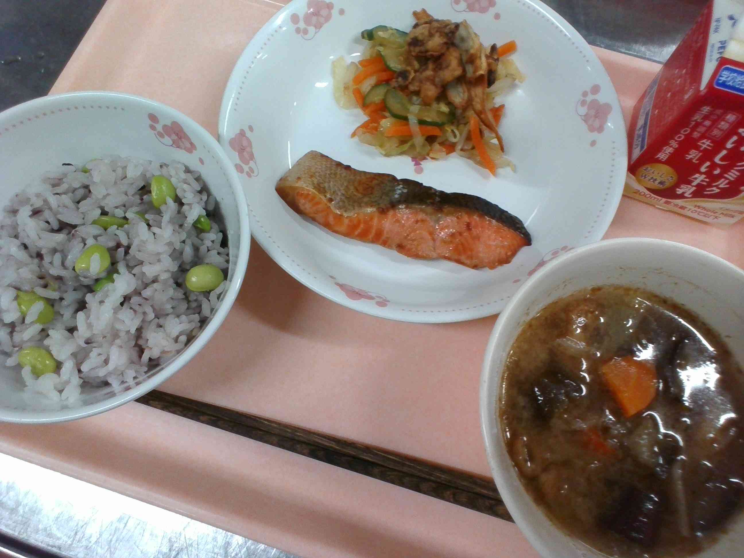 *お彼岸給食* ✿ 萩の花ごはん ✿ 牛乳 ✿ 鮭のピリッと焼き ✿ あさりのカラッとサラダ ✿ 秋なすのみそ汁