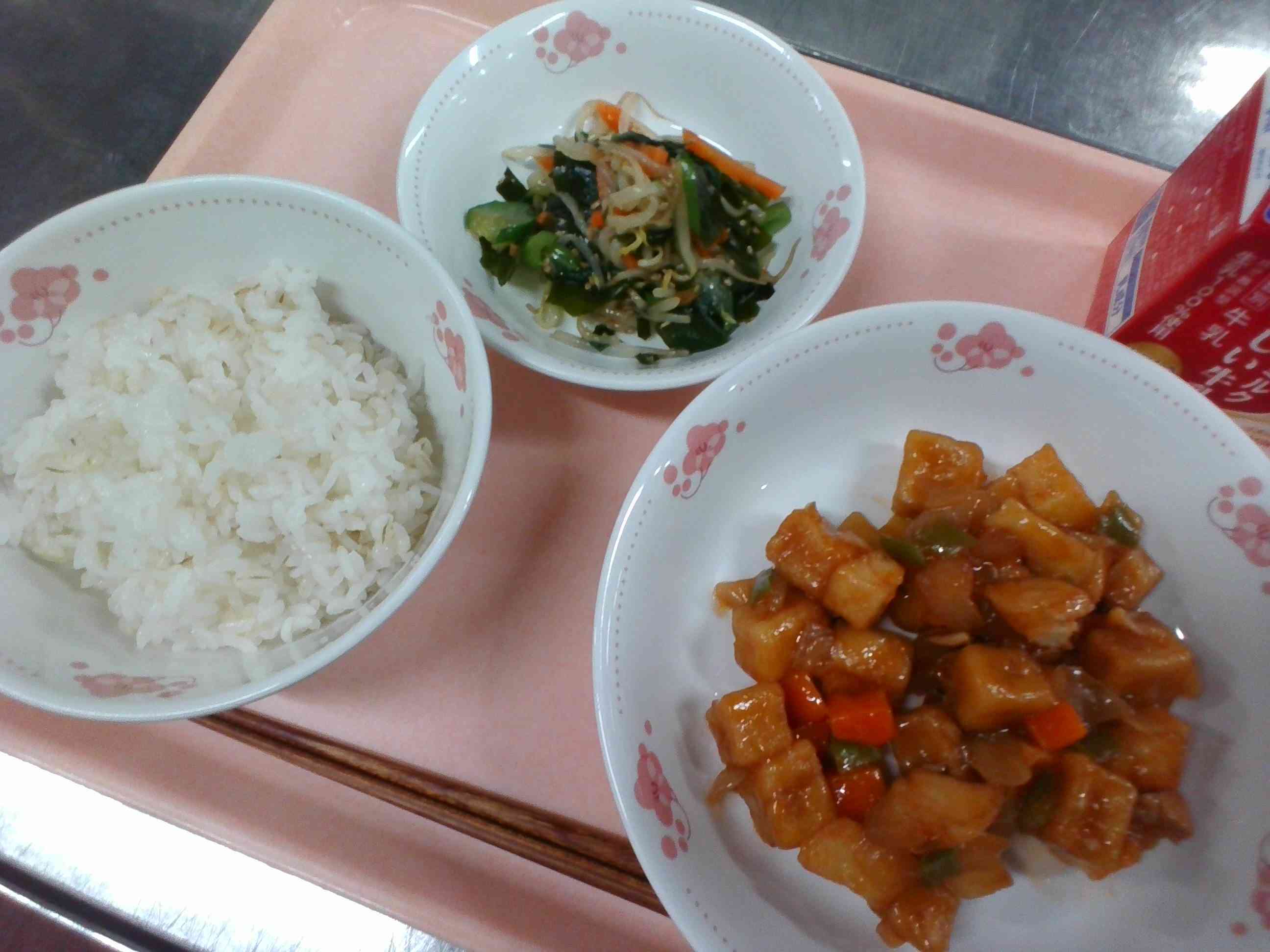 *5−2ランチルーム給食* ✿ 麦ごはん ✿ 牛乳 ✿ 高野豆腐の酢豚風 ✿ もやしとわかめのナムル