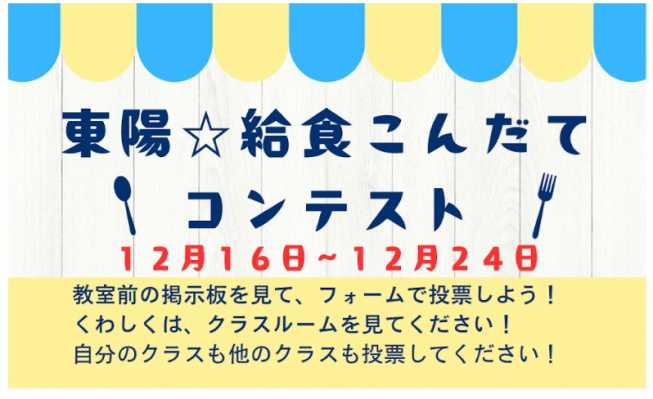 子どもたちは、家庭科の時間に給食の献立を考えました。栄養士さんに普段の給食の献立作りのポイントを聞いたことをもとに、テーマを考えて、メニューを決めました。給食に出たことのないメニューにチャレンジした子もいるなど、それぞれの工夫やこだわりが見られます。