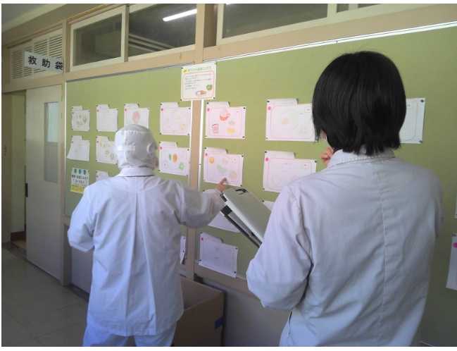 学年で友達の献立を見合うだけでなく、各クラスの担任、副校長先生や専門家である栄養士さんや調理員さんも参加してコンテストが開かれています。誰の献立が給食に採用されるのか楽しみです。写真は、調理員さんと栄養士さんが見に来てくださっている様子です。